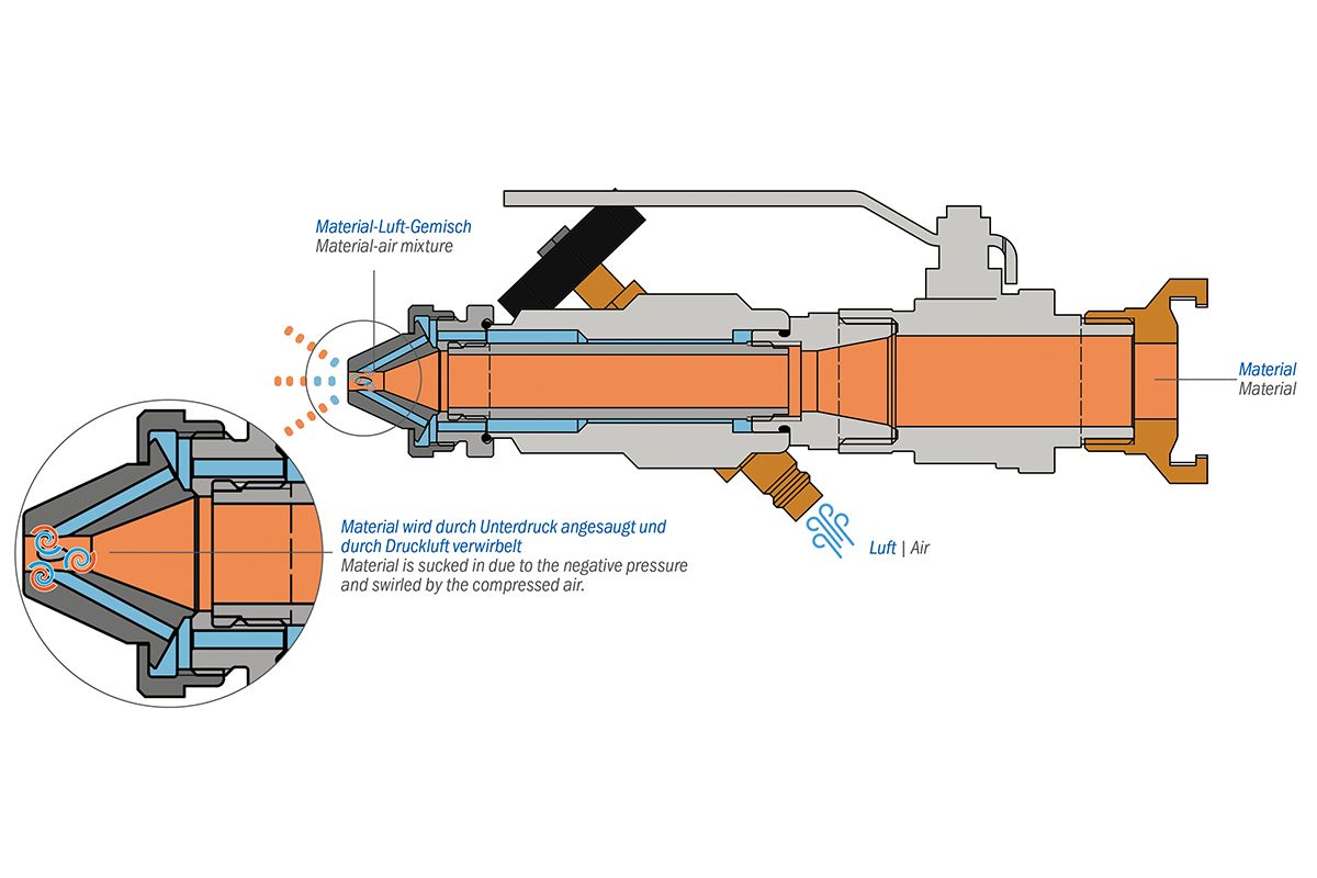 Die Spritzlanze dient zum nahtlosen Auftragen pastöser bis hochviskoser Materialien, wie mineralische, bitumenhaltige und bitumenfreie Dickbeschichtungen. Zusammen mit der Schneckenpumpe DESOI PowerInject SP20 gewährleistet die Spritzlanze einen homogenen Materialauftrag in der definierten Schichtdicke. Aufgrund ihrer Konstruktion eignet sie sich auch für große und/oder schwer zugängliche Flächen. Beim Einsatz der Spritzlanze entsteht am Lanzenende durch die Zufuhr von Luft ein Unterdruck, wodurch das Material schonend angesaugt und zerstäubt wird.
