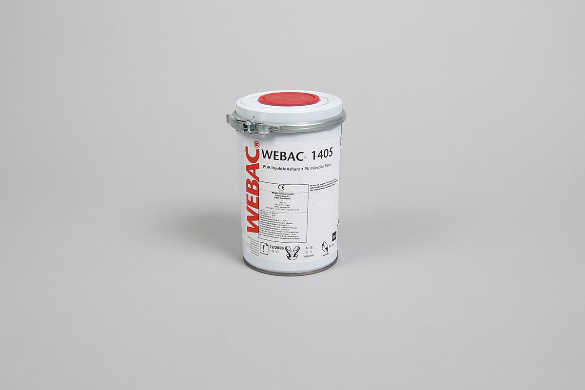 WEBAC® 1405 ist ein zweikomponentiges, langsam reagierendes Injektionsharz auf Polyurethanbasis. Es härtet aus durch Reaktion von A- und B-Komponente sowie durch Reaktion mit Wasser im Injektionsbereich. WEBAC® 1405 ist ein Injektionsstoff zum begrenzt Füllen von Rissen, Hohlräumen und Fehlstellen in Betonbauteilen gemäß EN 1504-5.